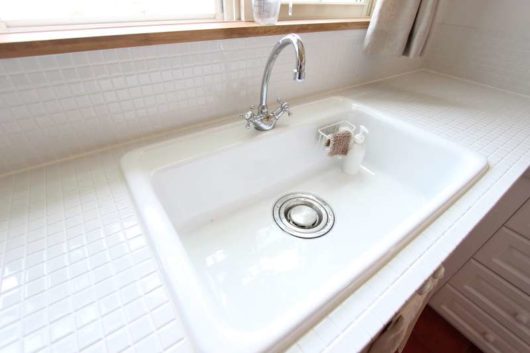 COMOのステンレス色付き白シンク、水栓はコーラー社のもの。