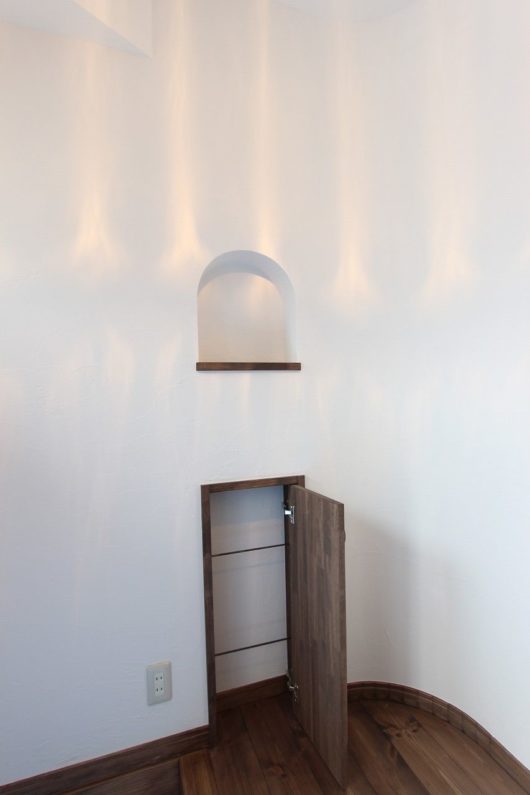 ④ 下の板をR形状にしたニッチ。ちょっと奥行きがあるものもディプレイ可能に♬