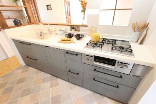 ⇩ 造作カップボードではないですが、タイルにシートを敷いていたお引越し後画像