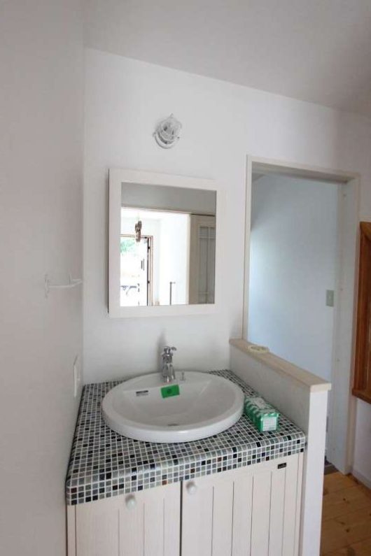 洗面台本体はもちろん、ミラーも造作。枠がタイル貼りは初の施工例✨