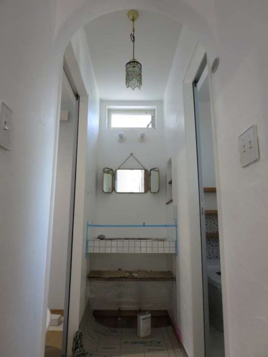 洗面入口上にお馴染みのアイアンパネル。右はパントリー兼奥様スペース💛