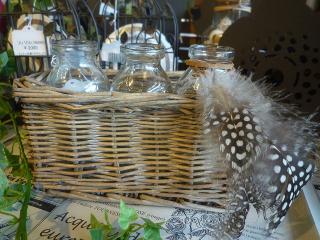 フェザーがアクセントの、ラタンのカゴに入った小瓶。 ¥1,600(税別)