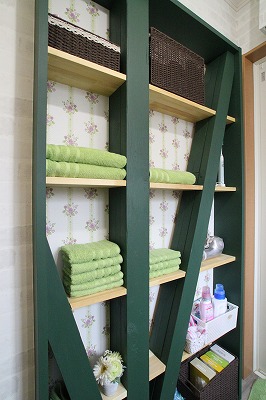 洗面所スペースに余裕があれば、こんな可動の棚も造れちゃいます。