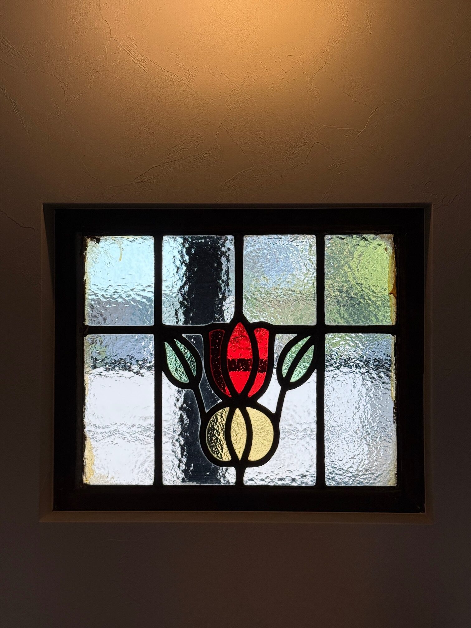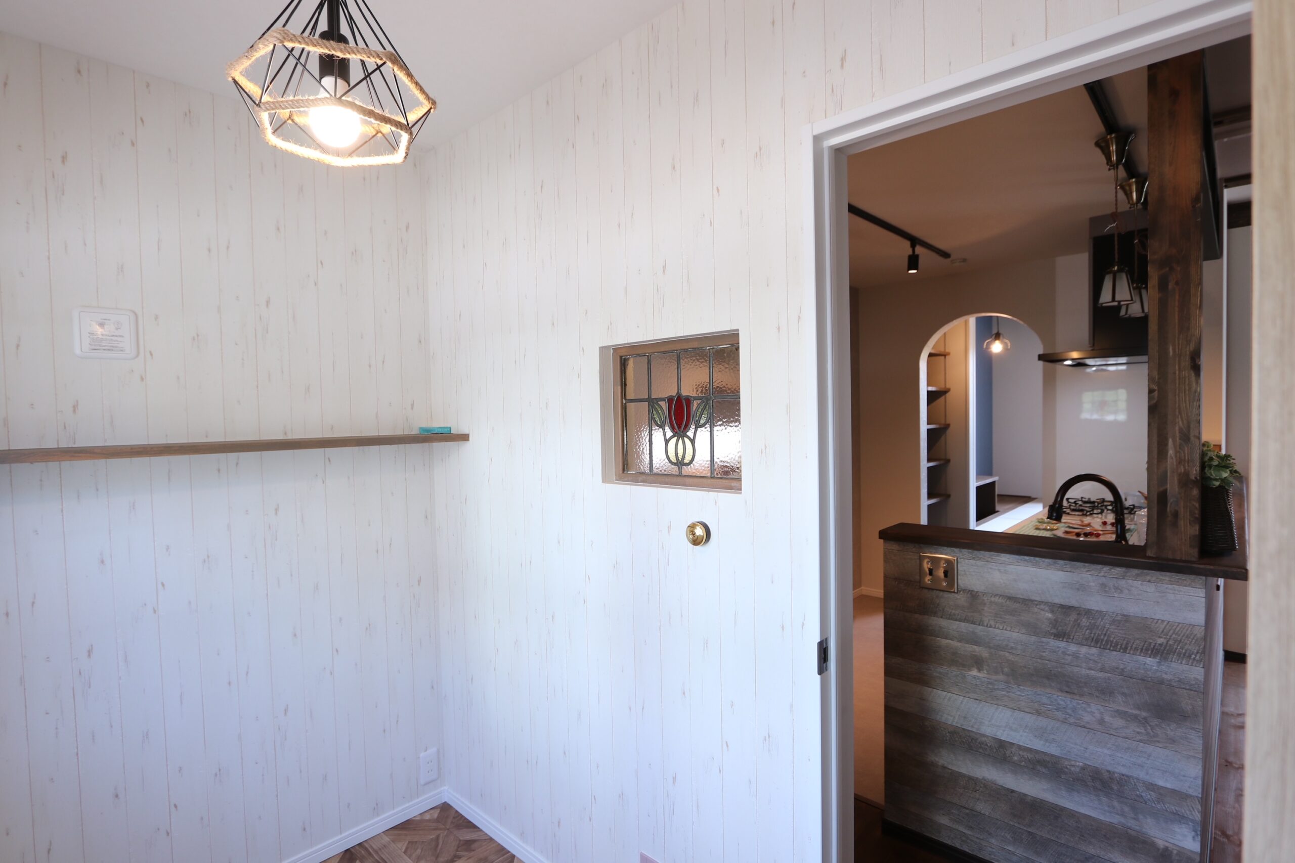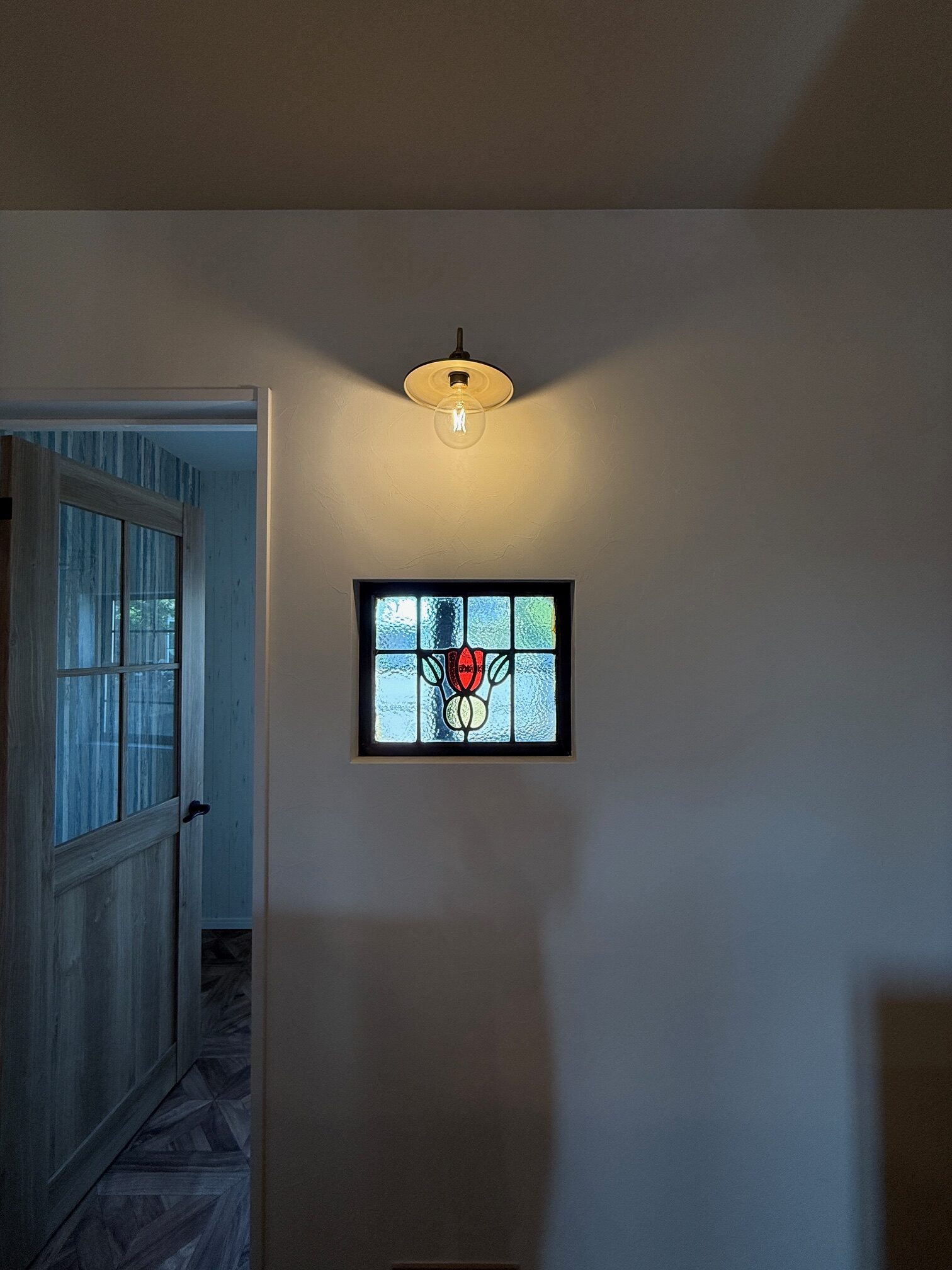 ブラケットライトとステンドグラスの組み合わせがとても素敵で目を惹きますね。
