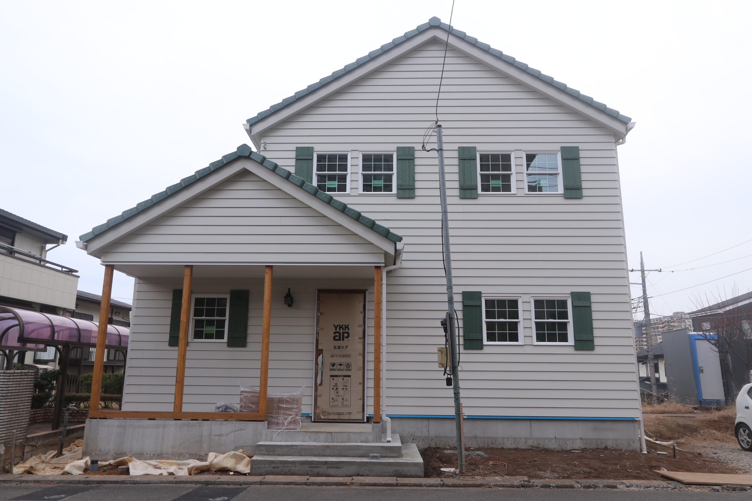 ラップサイディング+カバードポーチ、緑の屋根 が印象的なデザイン。
