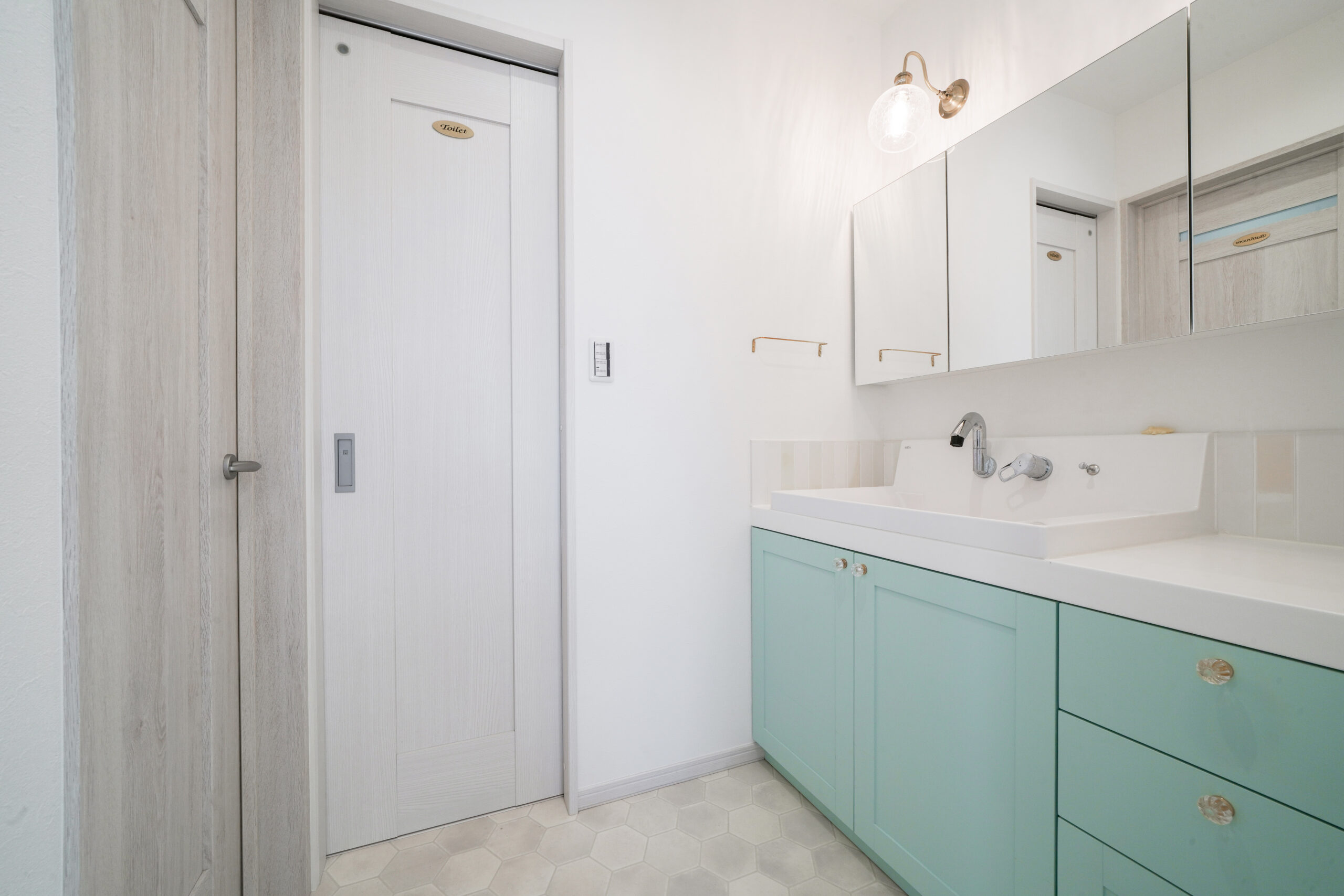 洗面は、ミントグリーンの造作洗面台!