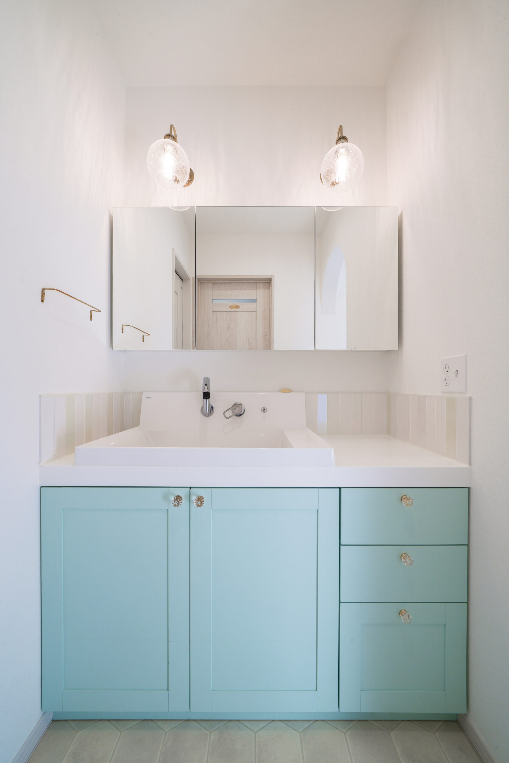 さらに、鏡上のブラケット照明が真鍮カラーで、全体のバランスを上品にまとめてくれています。