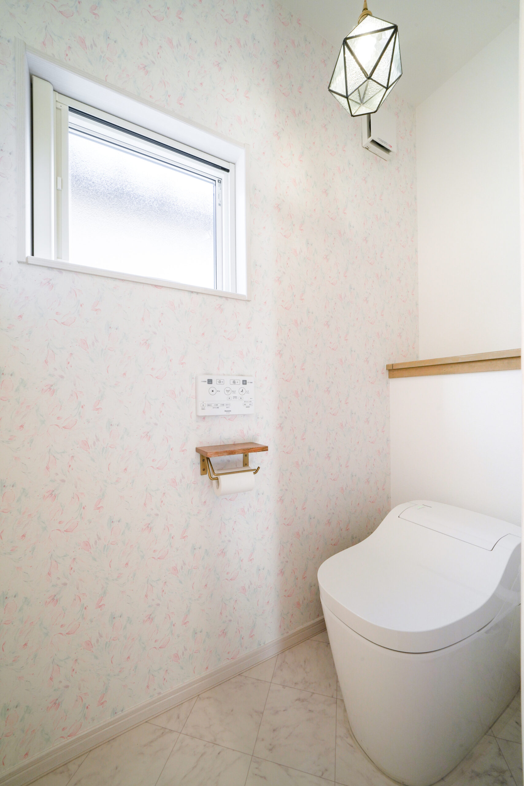 トイレは“やさしい花柄”でふんわり。照明もこだわりの一つ