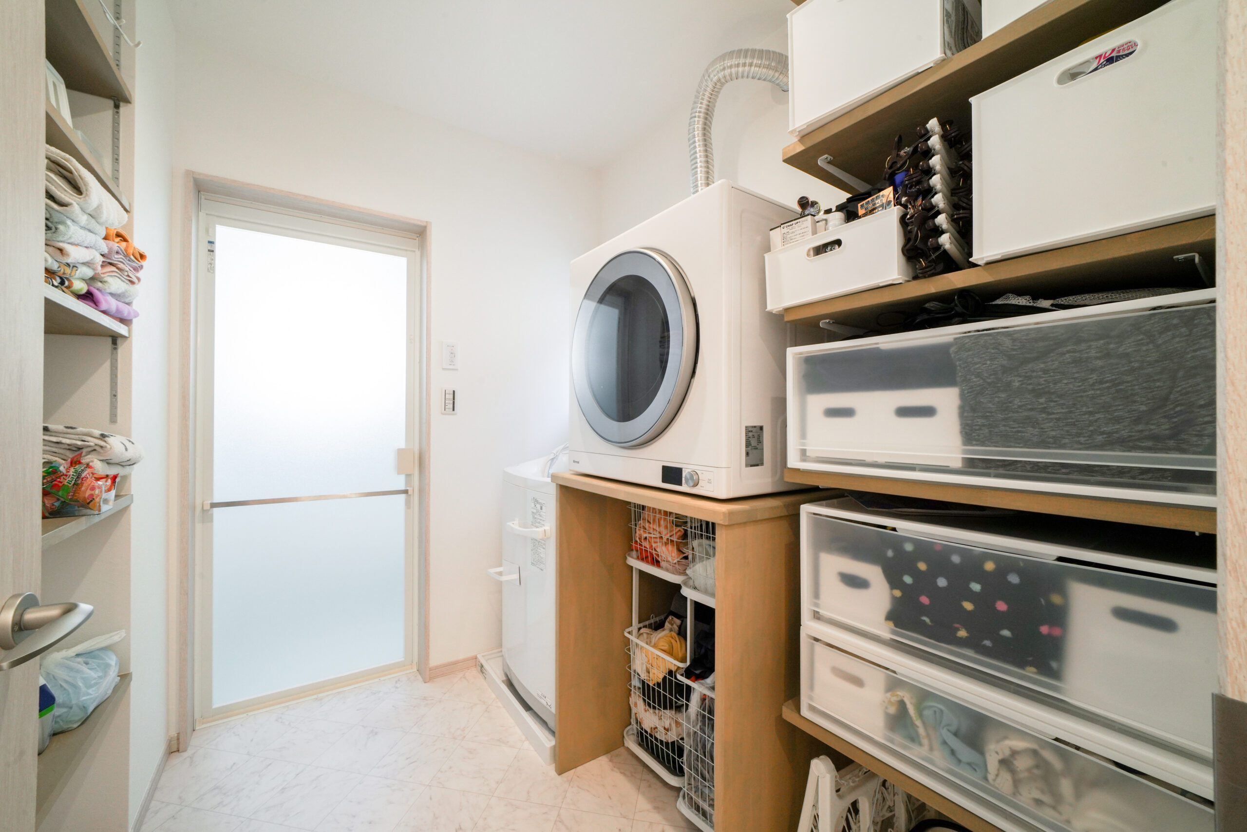 乾燥機+作業スペース+可動棚で、洗う→乾かす→しまうがスムーズ。