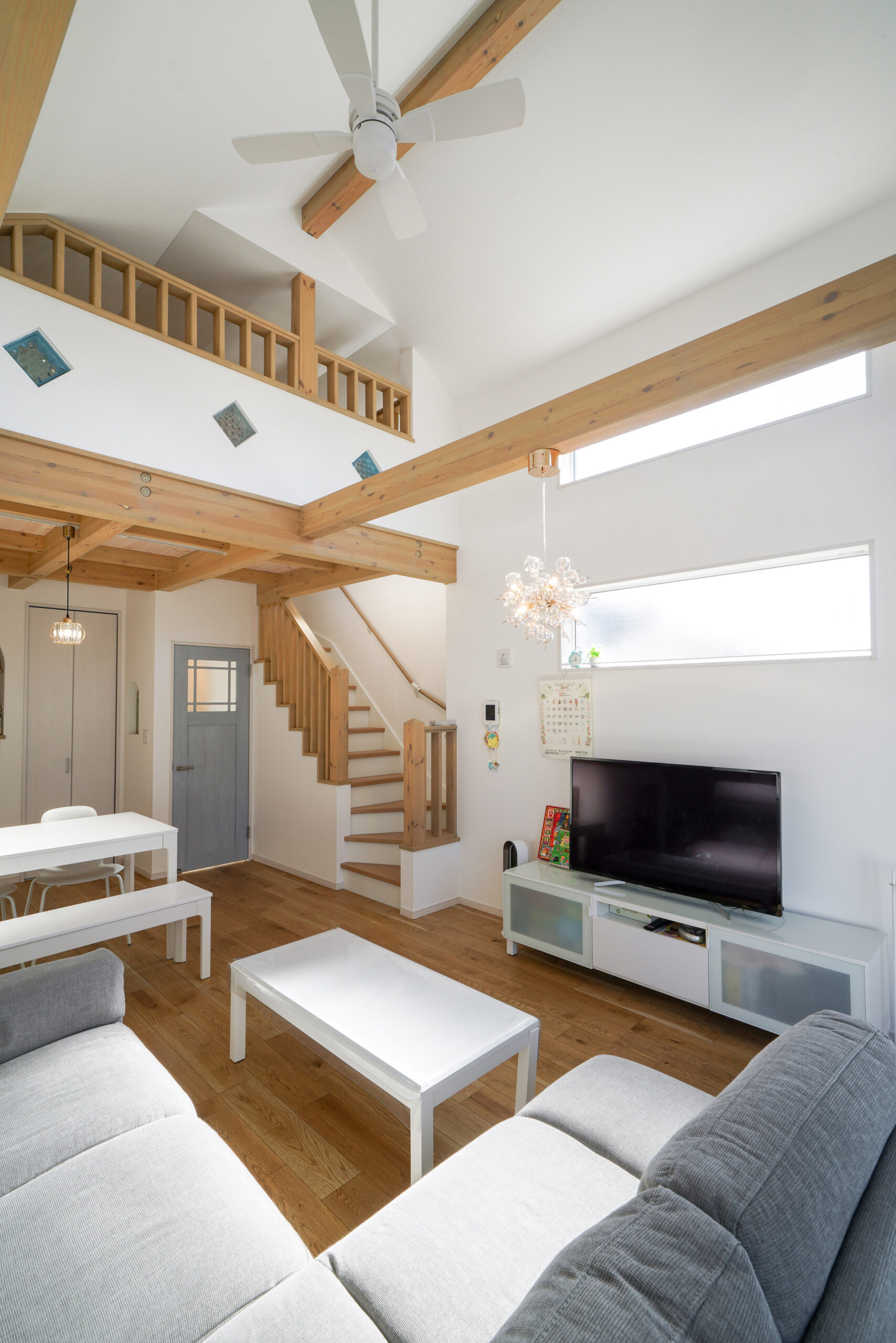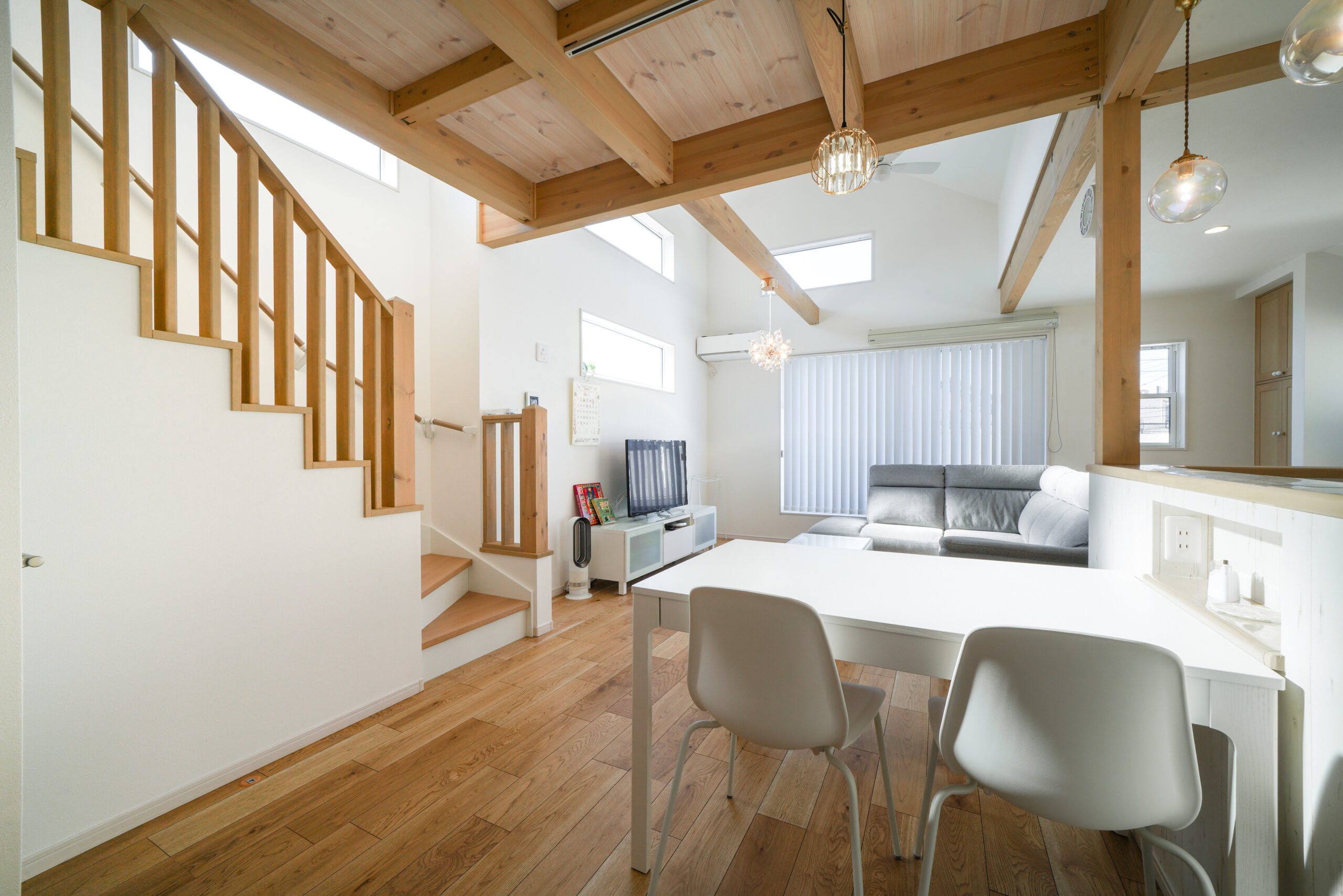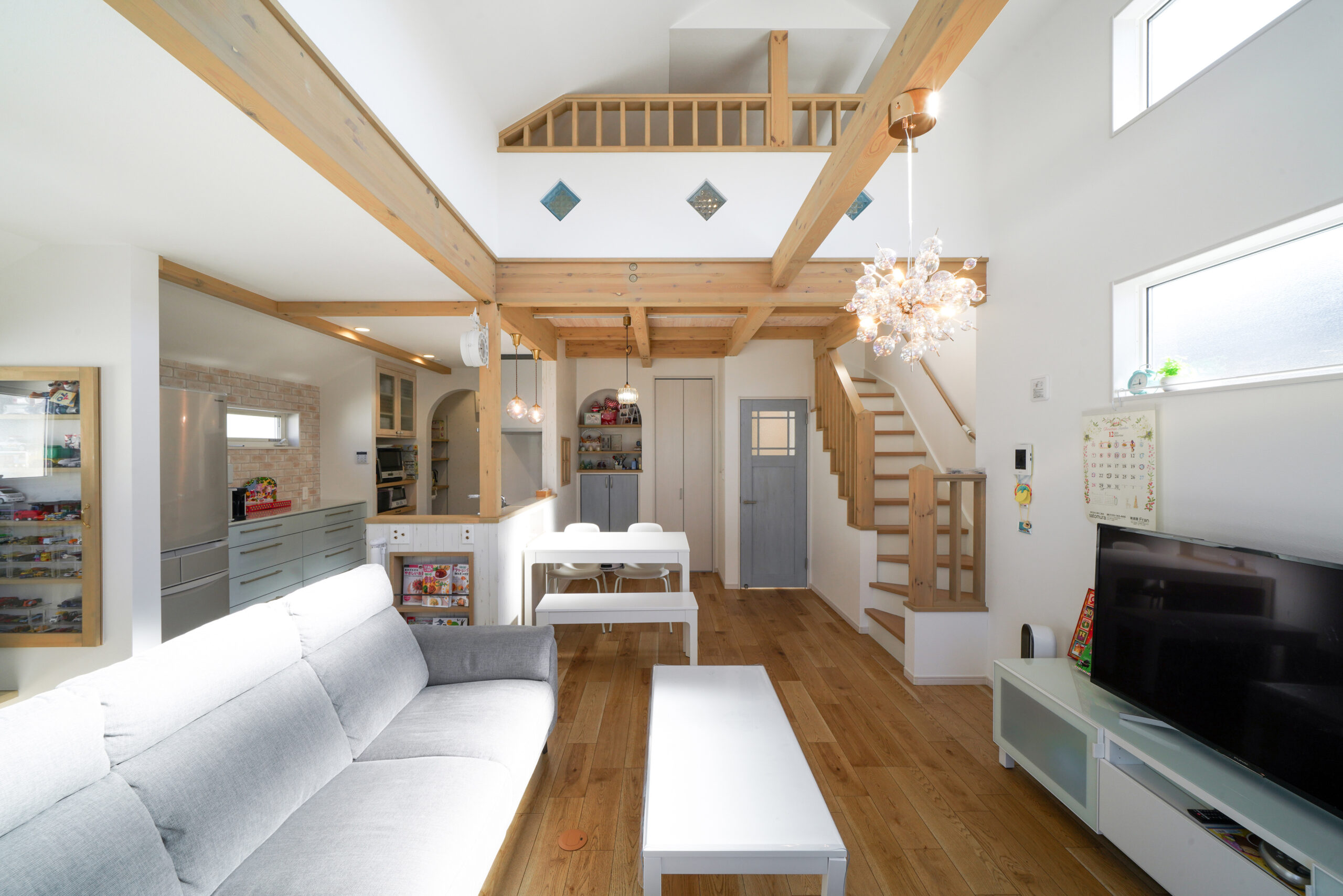 K様邸のLDKは 吹き抜け×梁×やさしいカラーの組み合わせに、