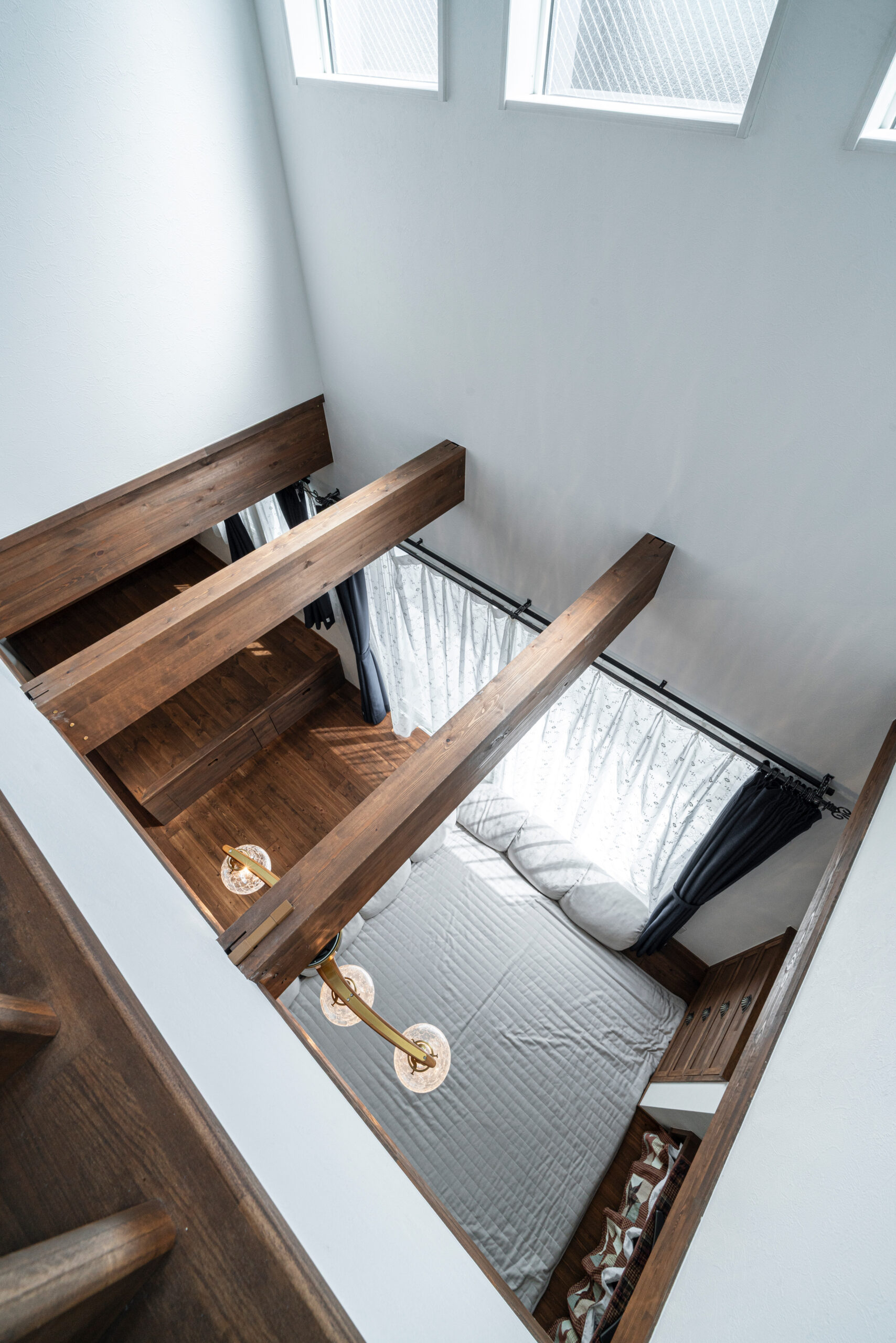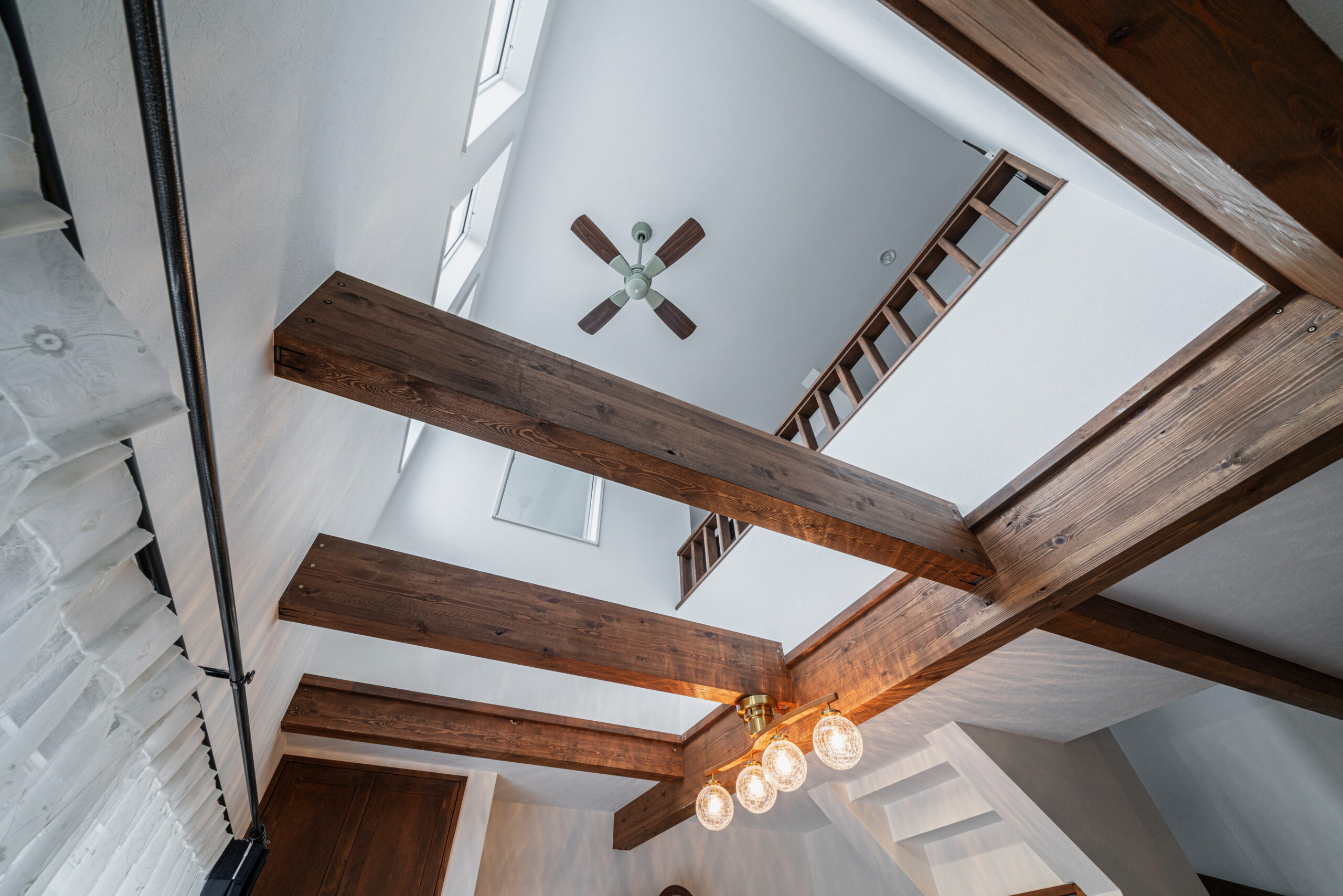 梁が立体的に交差する吹き抜けは、このお家の大きな見どころ。