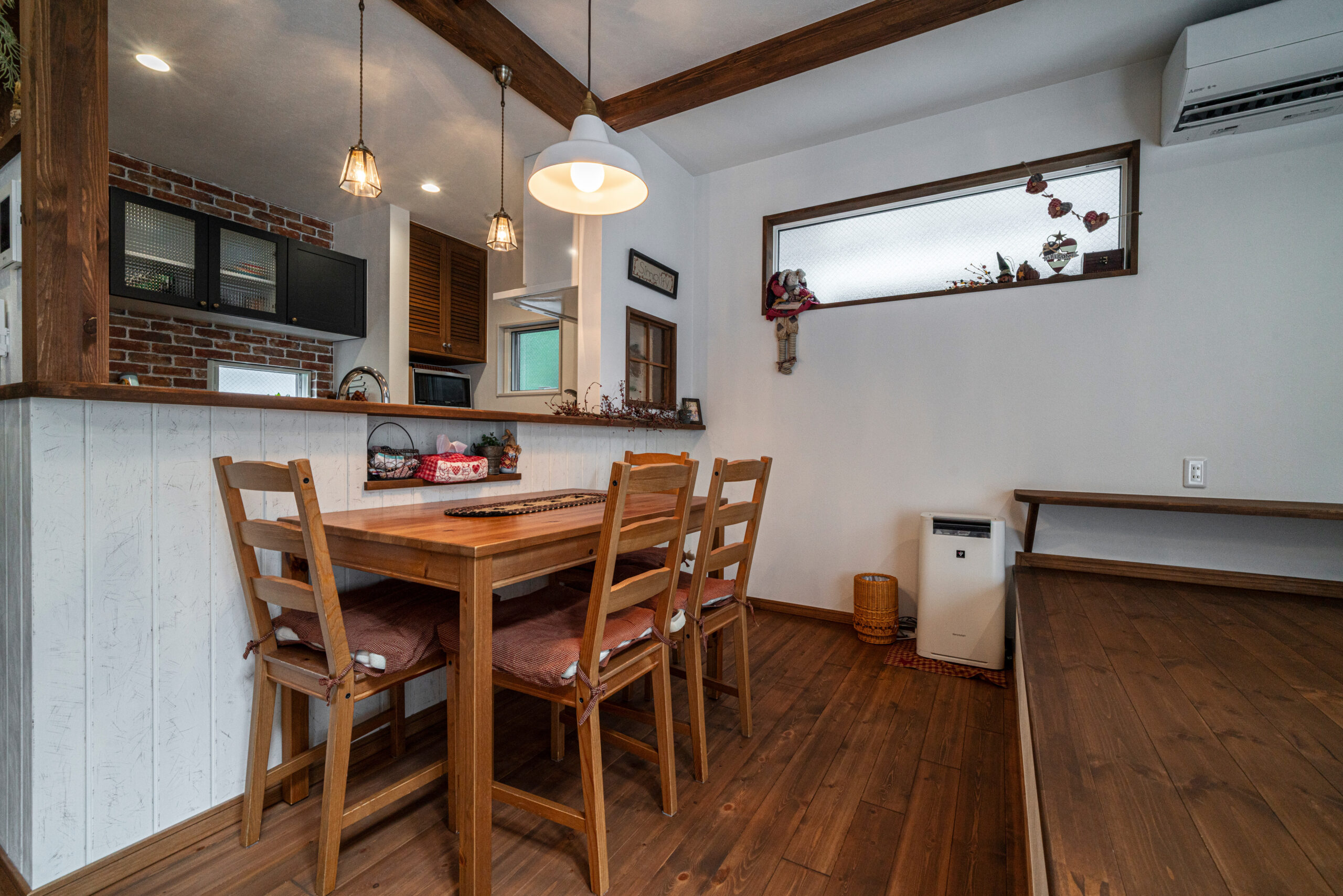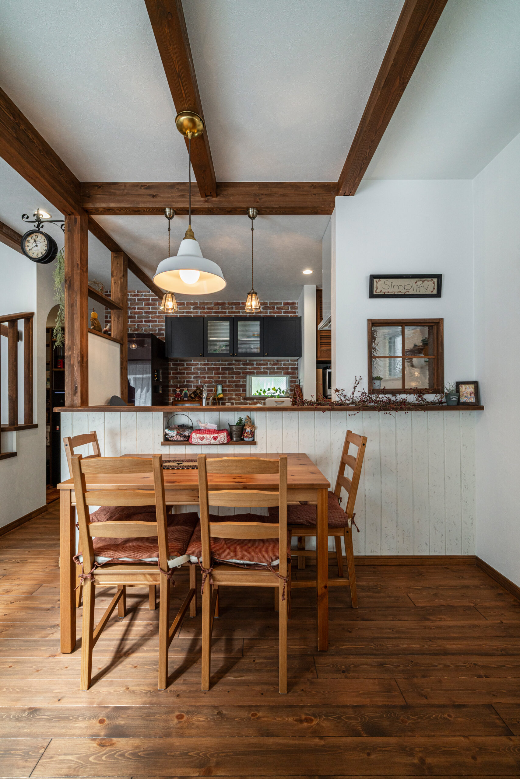 ダイニング側は、ペンダント照明の並びがとても絵になるポイント。