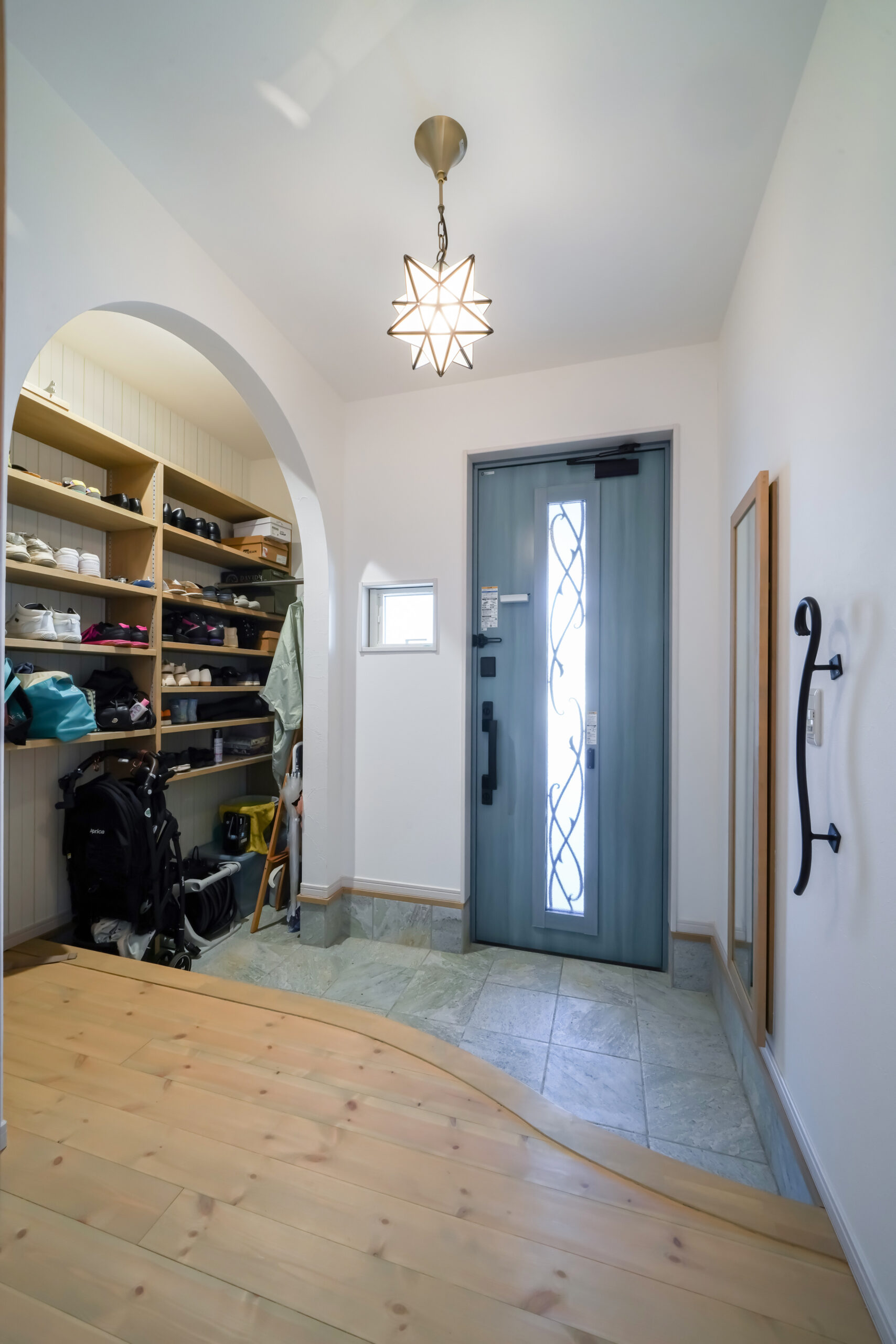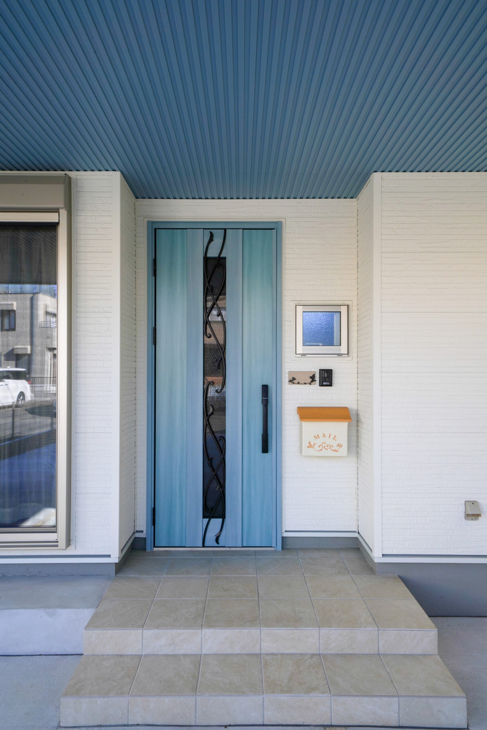 玄関ドアには、やさしいブルー系のカラーを採用。