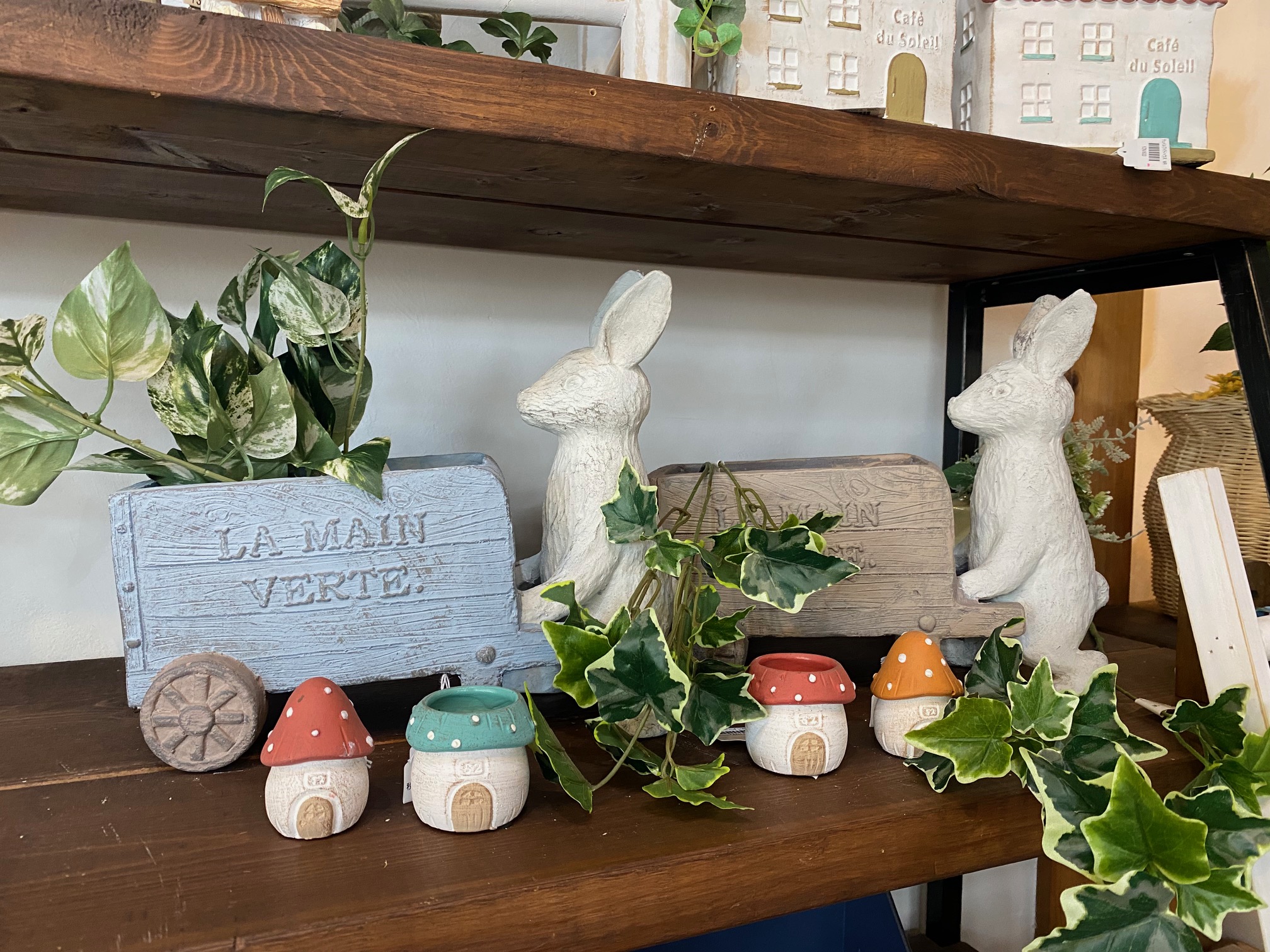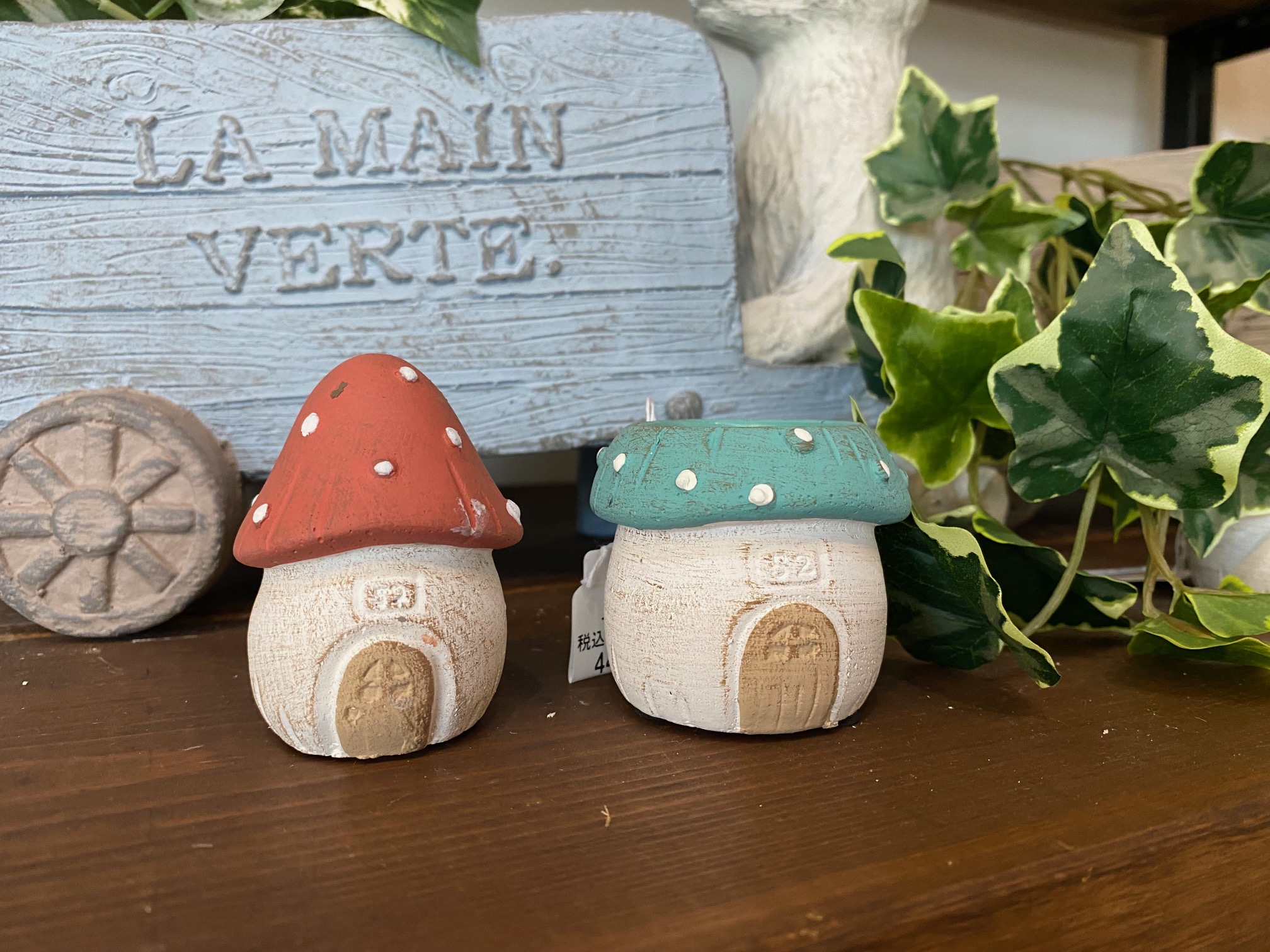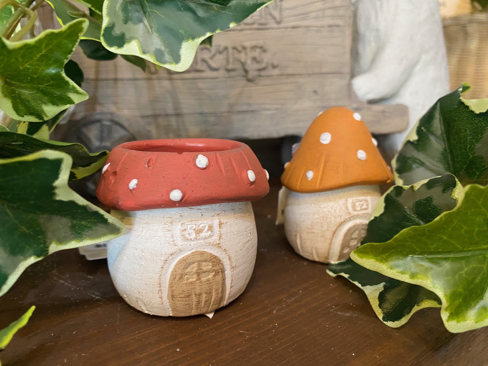 また一緒に写っているコロンとした姿がかわいいキノコのオブジェと多肉植物を植えると可愛いミニプランターが新しく仲間入りしました