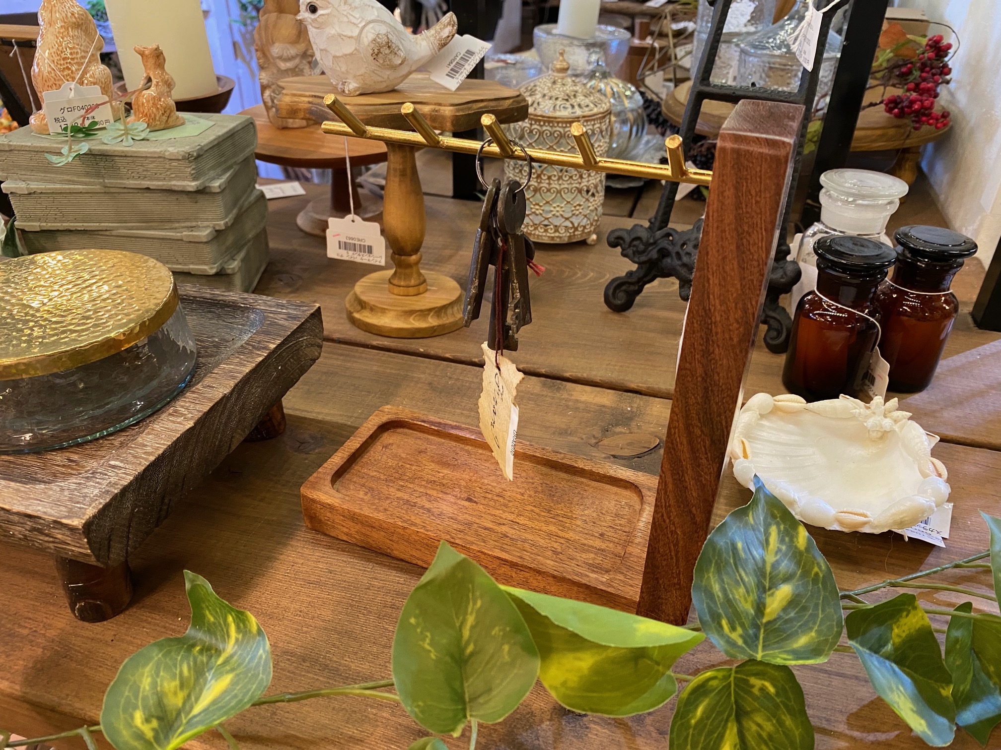 木製スタンドと真鍮の合わさったデザインがオシャレなキースタンドです
