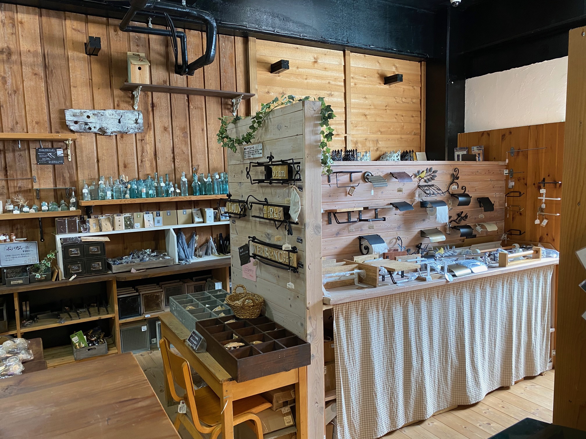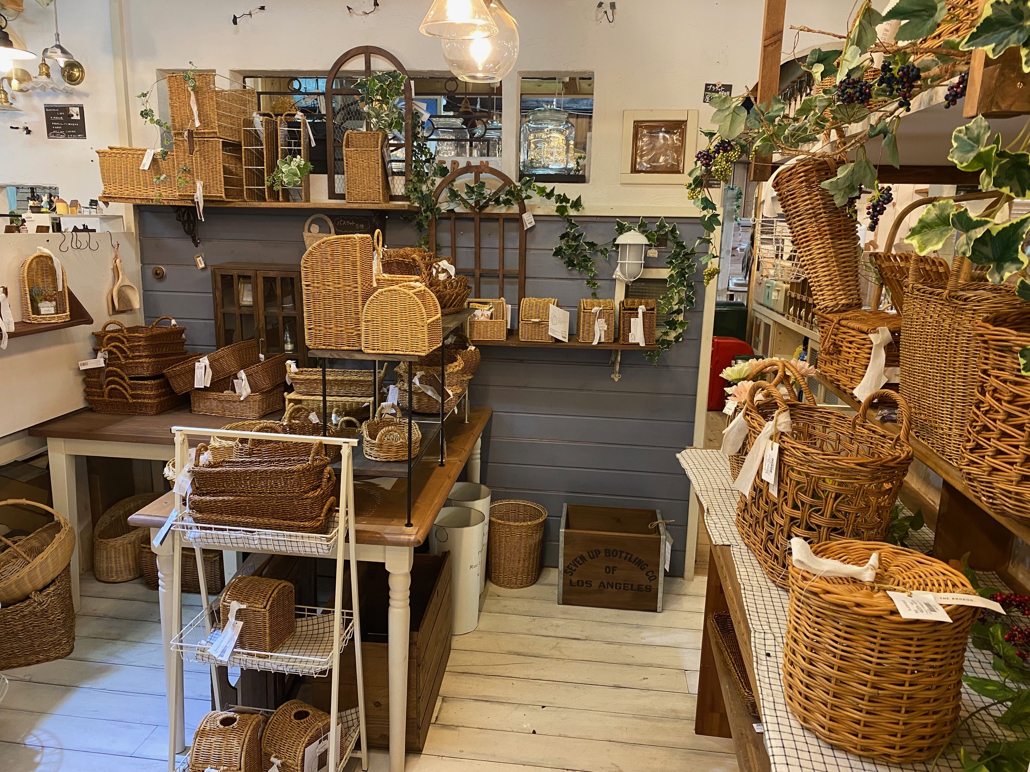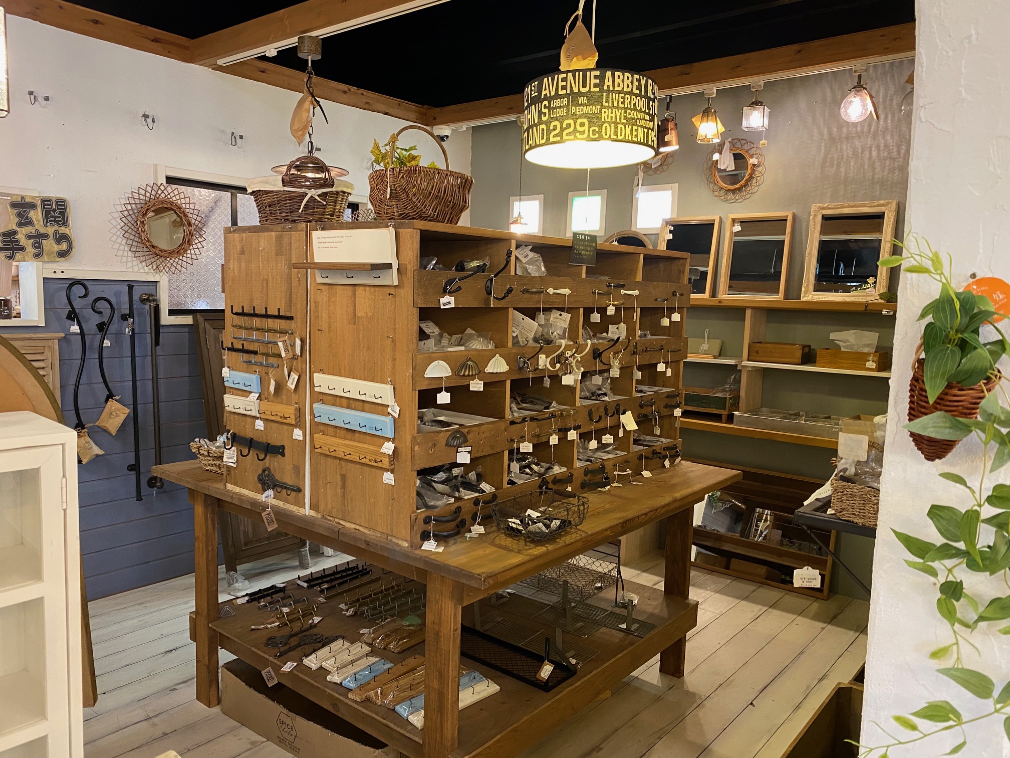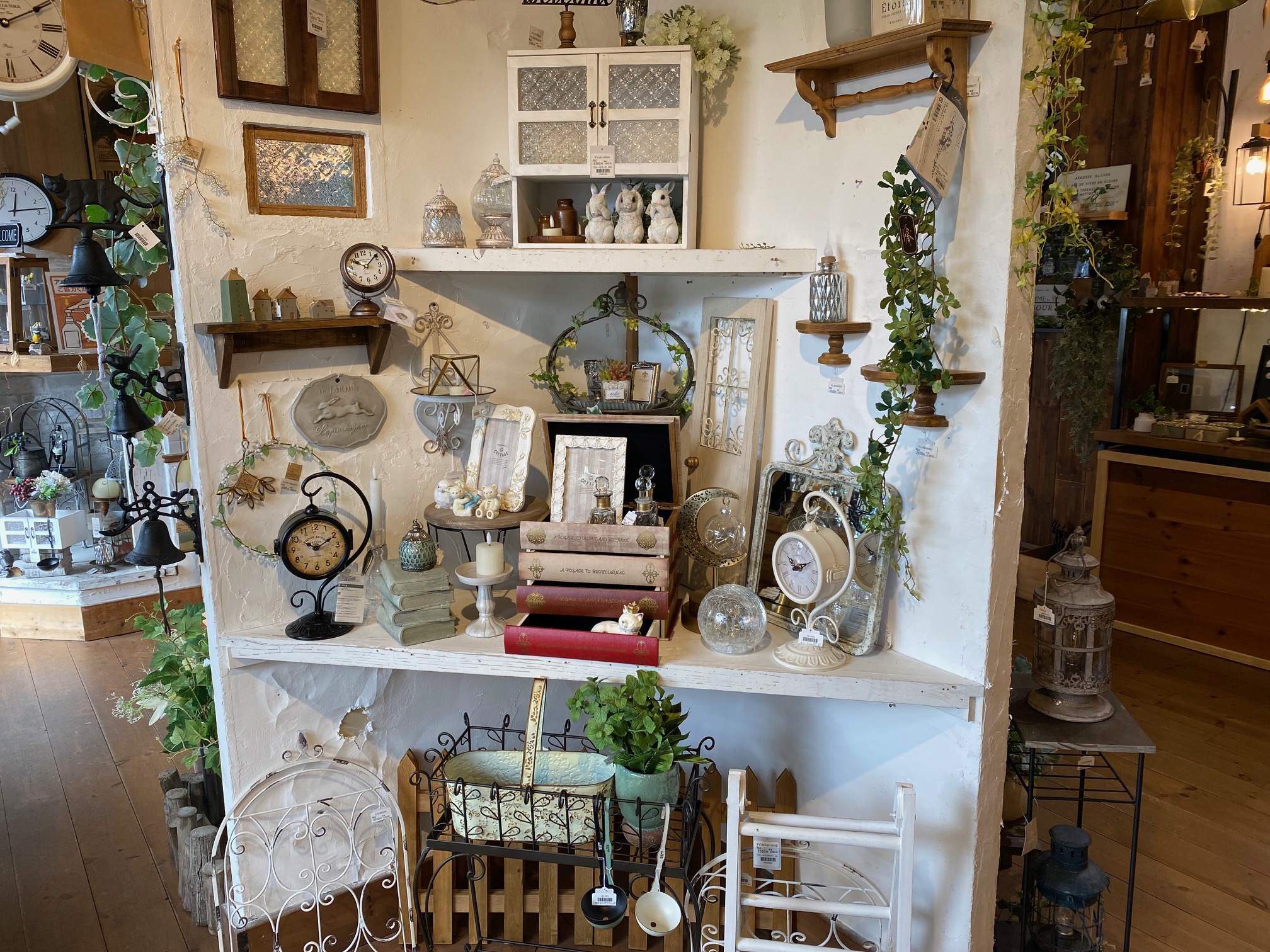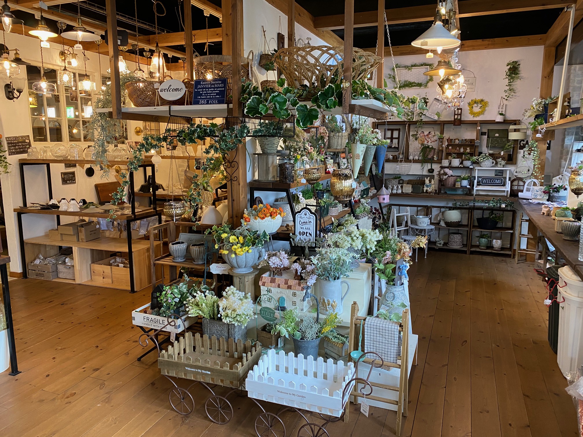 その向かい側から右奥にかけてはプランターやプランタースタンド、アーティフィシャルフラワーが数多く展示してあります
