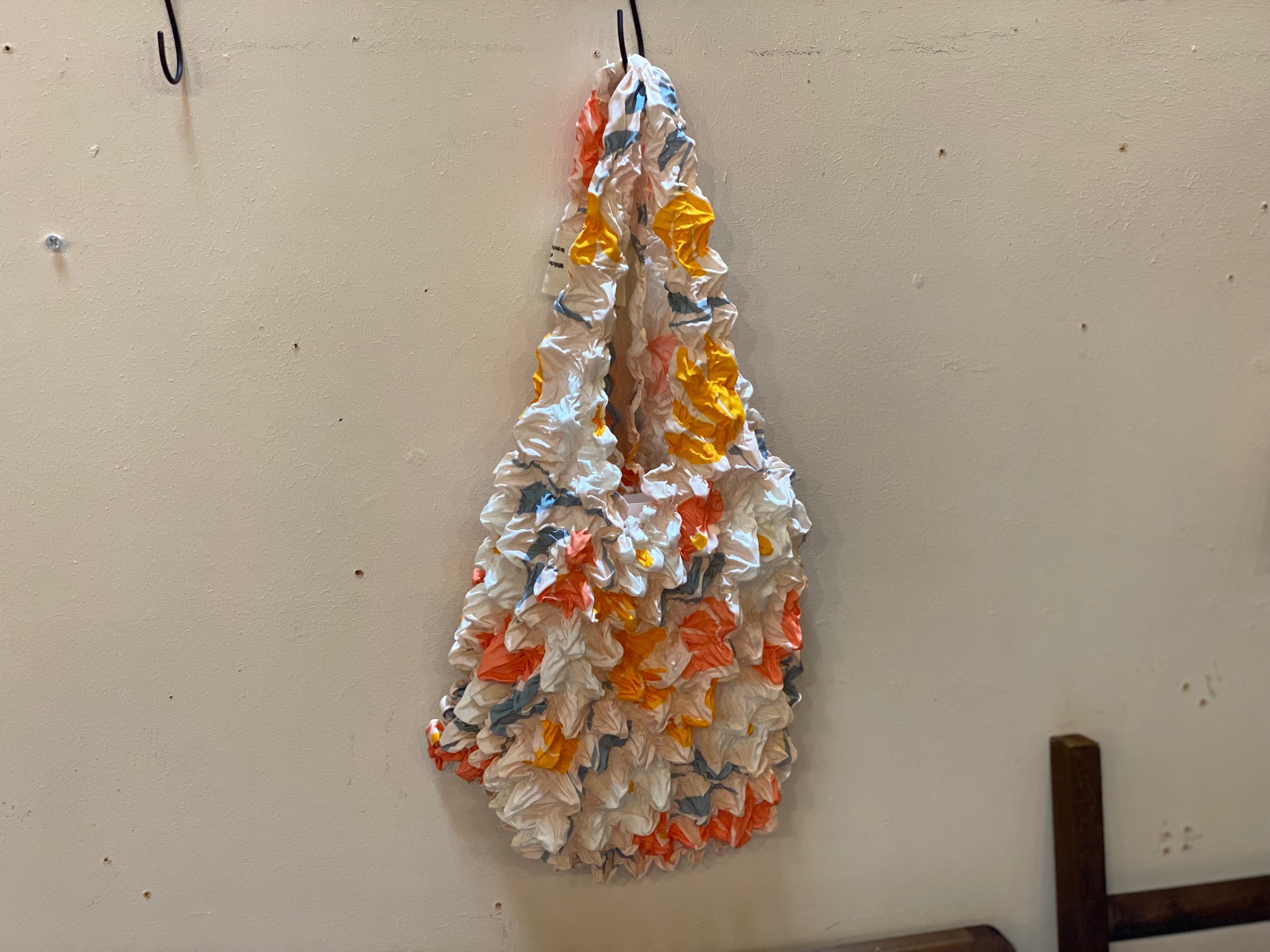くしゅくしゅっとした生地なので、畳む必要がなくサッと取り出して、使い終わったらサッと仕舞えて便利なしぼりバッグです